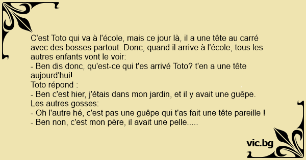 Un matin, Toto arrive à l'école avec un gros bandage sur la tête. La maîtresse lui demande: - Qu'est-ce qu'il t'es arrivé ? Toto répond: - J'étais dans le jardin, quand une guêpe s'est posée sur ma...