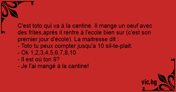 C'est toto qui va à la cantine. Il mange un oeuf avec des frites,aprés il rentre à l'ecole bien sur (c'est son premier jour d'école). La maitresse dit :