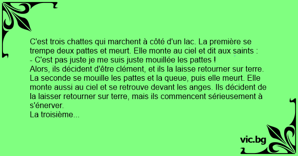 C'est trois chattes qui marchent à côté d'un lac. La première se trempe deux pattes et meurt. Elle monte au ciel et dit aux saints :