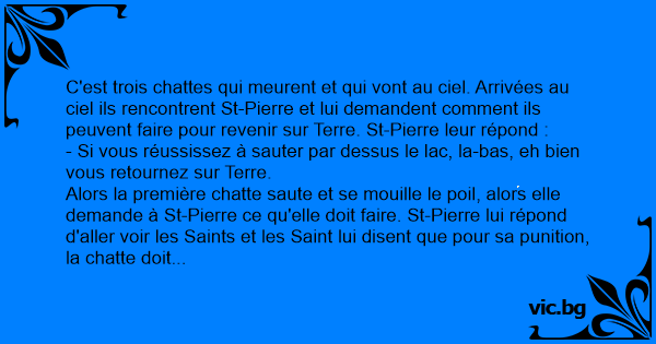 C'est trois chattes qui meurent et qui vont au ciel. Arrivées au ciel ils rencontrent St-Pierre et lui demandent comment ils peuvent faire pour revenir sur Terre. St-Pierre leur répond :