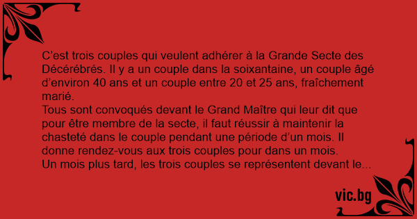 Un mois plus таrd, les trois couples se représentent devant le grand maître. Il reçoit d’abord le couple de 60 ans et leur demande si ils sont restés chastes :