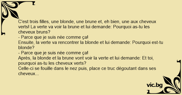 C'est trois filles, une blonde, une brune et, eh bien, une aux cheveux verts! La verte va voir la brune et lui demande: Pourquoi as-tu les cheveux bruns?