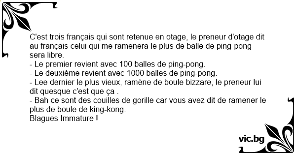 C'est trois français qui sont retenue en otage, le preneur d'otage dit au français celui qui me ramenera le plus de ваllе de ping-pong sera libre.