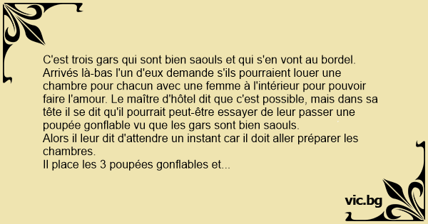 Arrivés là-bas l'un d'eux demande s'ils pourraient louer une chambre pour chacun avec une femme à l'intérieur pour pouvoir faire l'amour. Le maître d'hôtel dit que c'est possible, mais dans sa tête il se dit qu'il pourrait peut-être essayer de leur passer une poupée gonflable vu que les gars sont bien saouls.