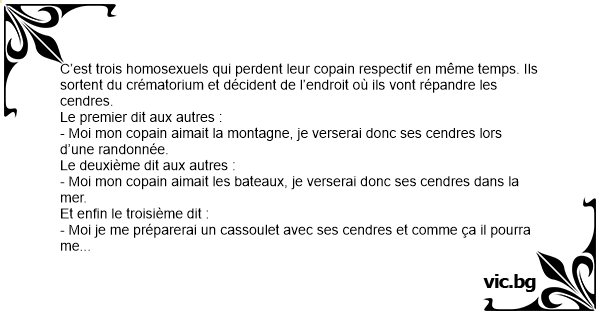 - Moi je me préparerai un cassoulet avec ses cendres et comme ça il pourra me défoncer le cul une dernière fois!