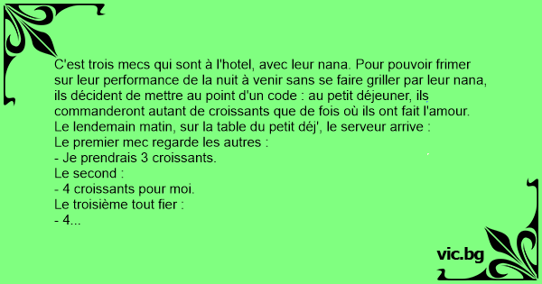C'est trois mecs qui sont à l'hotel, avec leur nana. Pour pouvoir frimer sur leur performance de la nuit à venir sans se faire griller par leur nana, ils décident de mettre au point d'un code : au petit déjeuner, ils commanderont autant de croissants que de fois où ils ont fait l'amour.