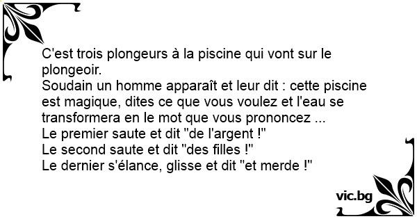 Soudain un homme apparaît et leur dit : cette piscine est magique, dites ce que vous voulez et l'eau se transformera en le mot que vous prononcez ...