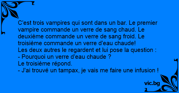 3 vampires se retrouvent dans un bar lugubre, en hiver, il fait froid.... Le premier demande: - "Un grand verre de sang bien chaud, s'il vous plaît!" le deuxième demande: - "un grand verre de sang...