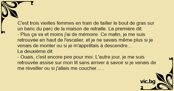 C'est trois vieilles femmes en train de tailler le bout de gras sur un banc du parc de la maison de retraite. La première dit: