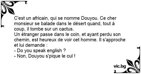 C'est un africain, qui se nomme Douyou. Ce cher monsieur se balade dans le désert quand, tout à coup, il tombe sur un cactus.