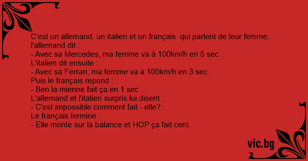 - Avec sa Ferrari, ma femme va à 100km/h en 3 sec .