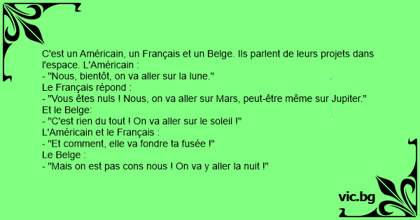 Jaloux des exploits astronautiques des Américains et des Russes, les Belges ont proposé d'aller se poser sur le soleil. Quand on leur a dit que c'était impossible à cause de la chaleur, ils ont...