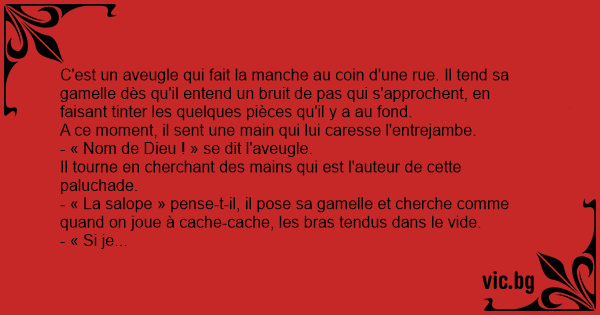 C'est un aveugle qui fait la manche au coin d'une rue. Il tend sa gamelle dès qu'il entend un bruit de pas qui s'approchent, en faisant tinter les quelques pièces qu'il y a au fond.