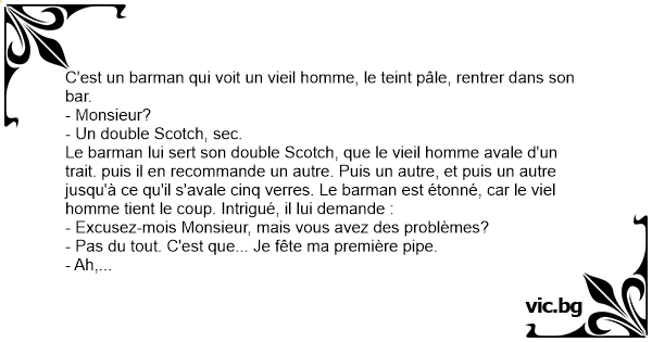C’est un type qui arrive dans un bar en courant et qui demande au serveur : Un habitué entre dans un bar et commande une Vodka. Le serveur lui dit : Un gars rentre dans un bar : - Un Ricard s'il vous plaît garçon ! -Le barman lui sert - Un autre !! - Le barman dit : eh ben vous fêtez quoi pour boire comme ça ? - ma première pipe répond le gars - Non c'est vrai. Laissez moi vous offrir un troisième verre alors ! - Non ça ira le goût est passé... En man kommer fram till baren och beställer 6 stycken whiskey. Bartendern frågar om det är något speciellt han ska fira. – Jag ska fira min första avsugning! – I så fall bjuder jag på den sjunde. –... A guy walks into a bar, orders six jägermeister shots. The bartender asks him if it's a special occation? The guy answers "yes indeed, my very first blowjob". The bartender gets excited and says... Момче влиза в бар и поръчва три мастики. Барманът му ги носи, а момчето си поръчва още три. Барманът се притеснил и решил да помогне. Попитал го дали няма някакви проблеми. - Не, днес ми беше... Een jongen van 16 gaat naar een bar en vraagt er aan de ober 10 whisky's. Die ober die verschiet en die zegt, meneer sorry ik kan dat niet doen, maar ik kan u wel al 1 whisky geven. De jongen wil... Een jongen komt een cafe binnen en bestelt zes Jagermeisters. De kastelein (nieuwsgierig als altijd) vraagt aan de jongen: “Mag ik weten waarom jij zes Jagermeisters bestelt?” De jongen antwoordt:... C'est un gars qui va au bistrot : Le gars : Patron, servez moi 7 pastis. Le patron : "-Ok, je vous les sers tous ensemble ?" Le gars : "ouais, vous les alignez là, sur le comptoir ..." Le gars... Un chico joven entra en un bar y pide una copa. Al de un rato pide otra, luego otra, y otra… así hasta 10 copas seguidas. El camarero, intrigado le pregunta: - Discúlpeme, pero ¿Por qué ha pedido... Chlap si dá v hospodě 6 fernetů a číšník se ho ptá: "K jaký příležitosti si je dáváte?" A chlap nato: "Moje první vykouření." "No, jestli to je takhle, tak tady máte sedmýho ferneta na mě!" "Hm,... Un homme entre dans un bar, commande un whisky et le bois cul sec. Puis un second, puis un troisième et un quatrième. Le Patron du bar surpris, demande: - Est-ce que je peux être indiscret et vous... Komt een man een bar binnen. De barman vraagt wat hij wilt drinken. Zegt de man: 'Doe maar 7 glaasjes Whiskey' Barman: 'Vier je soms iets?' Zegt de man: 'Ja, mijn eerste pijpbeurt!' 'O' zegt de...