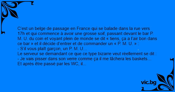 C’est un belge de passage en France qui se balade dans la rue vers 17h et qui commence à avoir une grosse soif, passant devant le bar P. M. U. du coin et voyant plein de monde se dit « tiens, ça a l’air bon dans ce bar » et il décide d’entrer et de commander un « P. M. U. » :