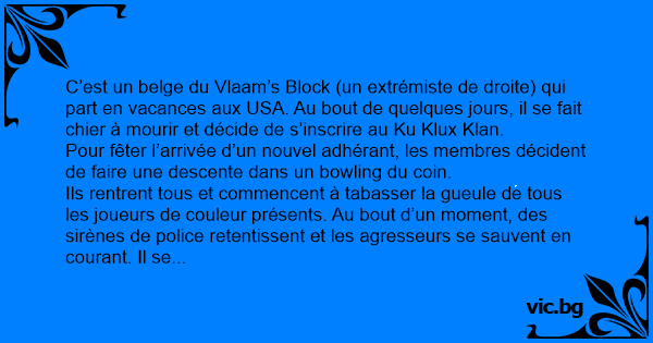 C’est un belge du Vlaam’s Block (un extrémiste de droite) qui part en vacances aux USA. Au bout de quelques jours, il se fait chier à mourir et décide de s’inscrire au Ku Klux Кlаn.
