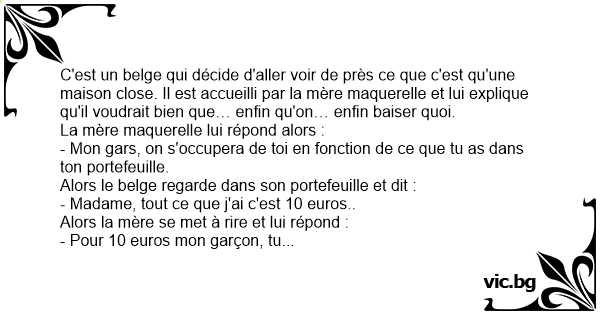 C'est un belge qui décide d'aller voir de près ce que c'est qu'une maison close. Il est accueilli par la mère maquerelle et lui explique qu'il voudrait bien que… enfin qu'on… enfin baiser quoi.