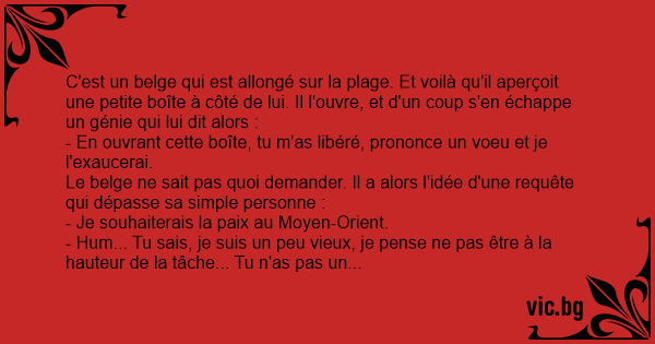 C'est un belge qui est allongé sur la plage. Et voilà qu'il aperçoit une petite boîte à côté de lui. Il l'ouvre, et d'un coup s'en échappe un génie qui lui dit alors :