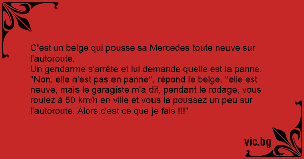 "Non, elle n'est pas en panne", répond le belge, "elle est neuve, mais le garagiste m'a dit, pendant le rodage, vous roulez à 50 km/h en ville et vous la poussez un peu sur l'autoroute. Alors c'est ce que je fais !!!"