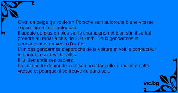 Le second lui demande la raison pour laquelle, il roulait à cette vitesse et pourquoi il se trouve nu dans sa voiture.
