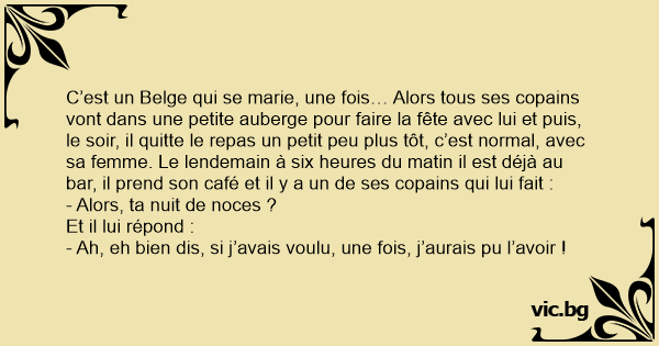 C’est un Belge qui se marie, une fois… Alors tous ses copains vont dans une petite auberge pour faire la fête avec lui et puis, le soir, il quitte le repas un petit peu plus tôt, c’est normal, avec sa femme. Le lendemain à six heures du matin il est déjà au bar, il prend son café et il y a un de ses copains qui lui fait :