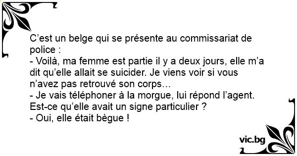 - Voilà, ma femme est partie il y a deux jours, elle m’a dit qu’elle allait se suicider. Je viens voir si vous n’avez pas retrouvé son corps…