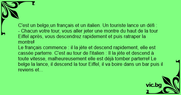 Le français commence : il la jète et descend rapidement, elle est cassée parterre. C'est au tour de l'italien : Il la jète et descend à toute vitesse, malheureusement elle est déjà tomber parterre! Le belge la lance, il descend la tour Eiffel, il va boire dans un bar puis il reviens et il la rattrape!