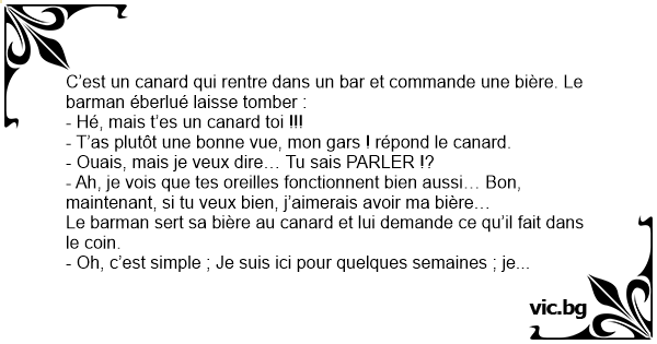 C’est un canard qui rentre dans un bar et commande une bière. Le barman éberlué laisse tomber :