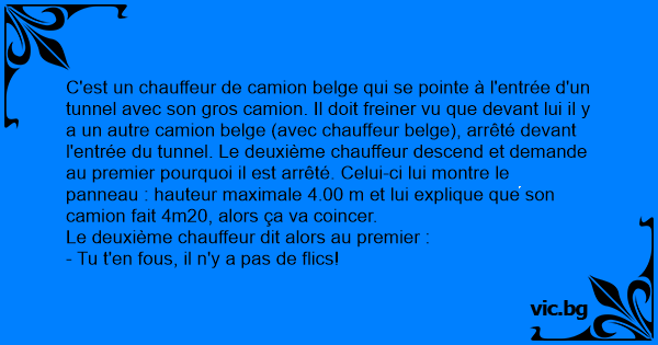 C'est un chauffeur de camion belge qui se pointe à l'entrée d'un tunnel avec son gros camion. Il doit freiner vu que devant lui il y a un autre camion belge (avec chauffeur belge), arrêté devant l'entrée du tunnel. Le deuxième chauffeur descend et demande au premier pourquoi il est arrêté. Celui-ci lui montre le panneau : hauteur maximale 4.00 m et lui explique que son camion fait 4m20, alors ça va coincer.