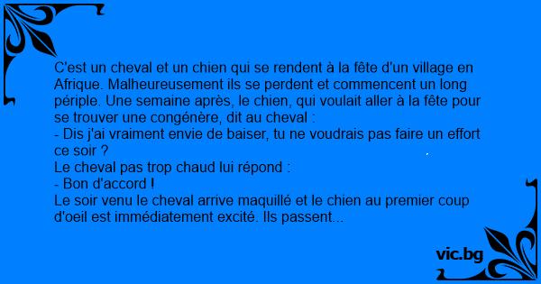Le soir venu, le chien arrive à peine maquillé, et a tout fait pour dégoutter le cheval. Mais ce dernier étant tellement impatient, il attrape le chien et commence son affaire. Au bout de 10 minutes le cheval demande au chien :