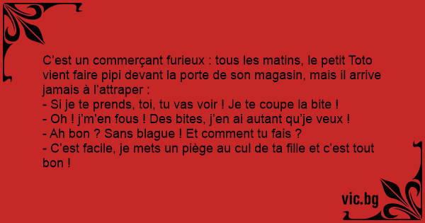 C’est un commerçant furieux : tous les matins, le petit Toto vient faire pipi devant la porte de son magasin, mais il arrive jamais à l’attraper :