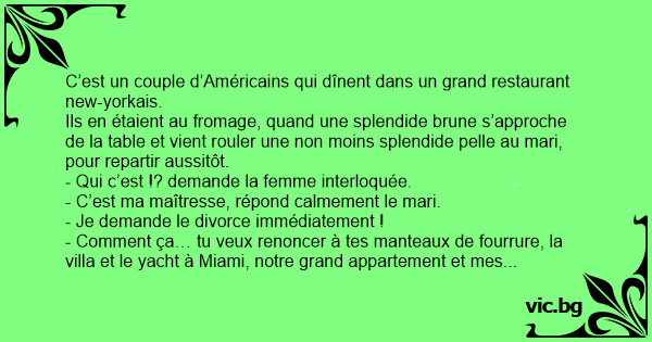 - Tu vois, dit le mari, à la table du fond là-bas, Jim Parker avec la blonde… Eh bien c’est sa maîtresse aussi.