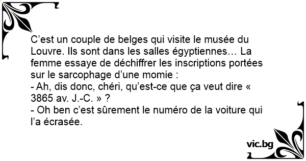 C’est un couple de belges qui visite le musée du Louvre. Ils sont dans les salles égyptiennes… La femme essaye de déchiffrer les inscriptions portées sur le sarcophage d’une momie :