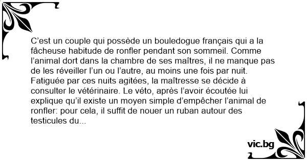 Fatiguée par ces nuits agitées, la maîtresse se décide à consulter le vétérinaire. Le véto, après l’avoir écoutée lui explique qu’il existe un moyen simple d’empêcher l’animal de ronfler: pour cela, il suffit de nouer un ruban autour des testicules du bouledogue.