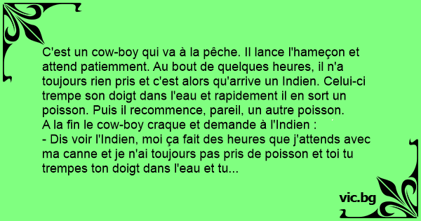 - C'est simple соw-boy, avant de partir à la pêche tu trempes ton doigt dans le sexe de ta femme et après tu attrapes tout ce que tu veux.