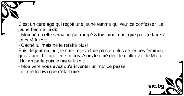 Puis de jour en jour, le curé reçevait de plus en plus de jeunes femmes qui avaient trompé leurs maris. Alors le curé décide d'aller voir le Maire. Il lui en parle puis le maire lui dit: