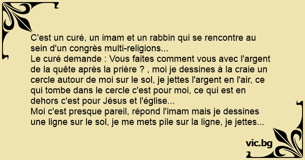 Le curé demande : Vous faites comment vous avec l'argent de la quête après la prière ? , moi je dessines à la craie un cercle autour de moi sur le sol, je jettes l'argent en l'air, ce qui tombe dans le cercle c'est pour moi, ce qui est en dehors c'est pour Jésus et l'église...