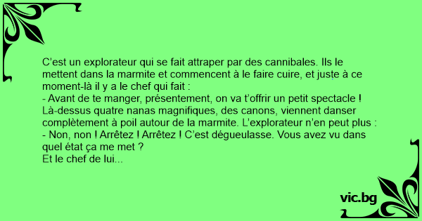C’est un explorateur qui se fait attraper par des cannibales. Ils le mettent dans la marmite et commencent à le faire cuire, et juste à ce moment-là il y a le chef qui fait :