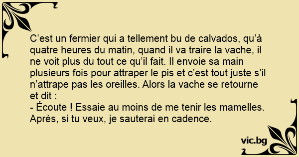C’est un fermier qui a tellement bu de calvados, qu’à quatre heures du matin, quand il va traire la vache, il ne voit plus du tout ce qu’il fait. Il envoie sa main plusieurs fois pour attraper le pis et c’est tout juste s’il n’attrape pas les oreilles. Alors la vache se retourne et dit :