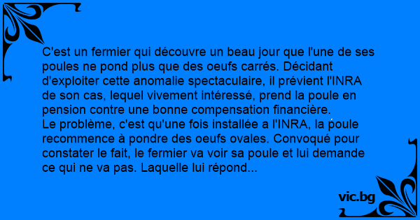 Le problème, c'est qu'une fois installée a l'INRA, la poule recommence à pondre des oeufs ovales. Convoqué pour constater le fait, le fermier va voir sa poule et lui demande ce qui ne va pas. Laquelle lui répond alors: