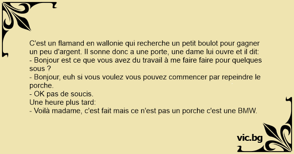 C'est un flamand en wallonie qui recherche un petit boulot pour gagner un peu d'argent. Il sonne donc a une porte, une dame lui ouvre et il dit: