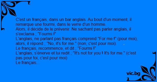 C'est un français, dans un bar anglais. Au bout d'un moment, il remarque une fourmi, dans le verre d'un homme.