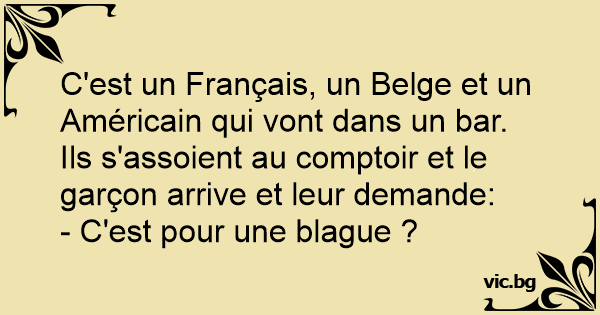 C'est un Français, un Belge et un Américain qui vont dans un bar. Ils s'assoient au comptoir et le garçon arrive et leur demande: