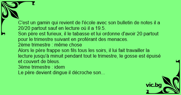C'est un gamin qui revient de l'école avec son bulletin de notes il a 20/20 partout sauf en lecture où il a 19.5.