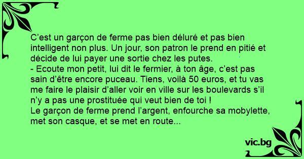 - Ecoute mon petit, lui dit le fermier, à ton âge, c’est pas sain d’être encore puceau. Tiens, voilà 50 euros, et tu vas me faire le plaisir d’aller voir en ville sur les boulevards s’il n’y a pas une prostituée qui veut bien de toi !
