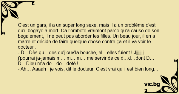 C’est un gars, il a un super long sexe, mais il a un problème c’est qu’il bégaye à mort. Ca l’embête vraiment parce qu’à cause de son bégaiement, il ne peut pas aborder les filles. Un beau jour, il en a marre et décide de faire quelque chose contre ça et il va voir le docteur :