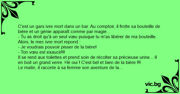 Le matin, il raconte à sa femme son aventure de la veille... Elle ne le croit pas mais lorsque son mari a finalement envie à nouveau, elle en boit un grand verre et constate l'épatante nouvelle... A chaque fois que le gars a une envie d'uriner, il dit à sa femme "Chérie, apporte-moi deux verres, on trinque !" Ce manège dure près de 2 semaines. Jusqu'au jour où le mari demande à sa femme de lui amener un seul verre... Alors sa femme lui demande :