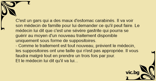 C'est un gars qui a des maux d'estomac carabinés. Il va voir son médecin de famille pour lui demander ce qu'il peut faire. Le médecin lui dit que c'est une sévère gastrite qui pourra se guérir au moyen d'un nouveau traitement disponible uniquement sous forme de suppositoires.