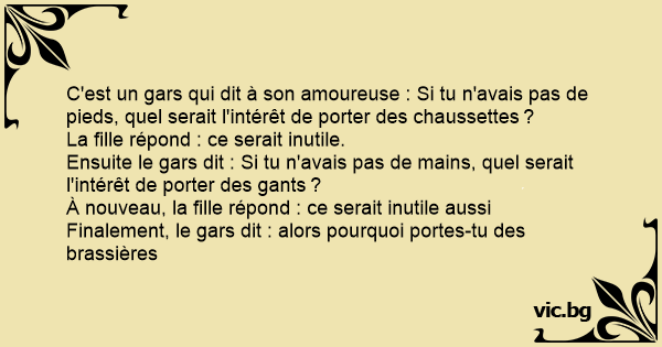 C'est un gars qui dit à son amoureuse : Si tu n'avais pas de pieds, quel serait l'intérêt de porter des chaussettes ?