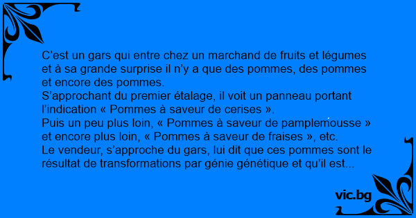 C’est un gars qui entre chez un marchand de fruits et légumes et à sa grande surprise il n’y a que des pommes, des pommes et encore des pommes.